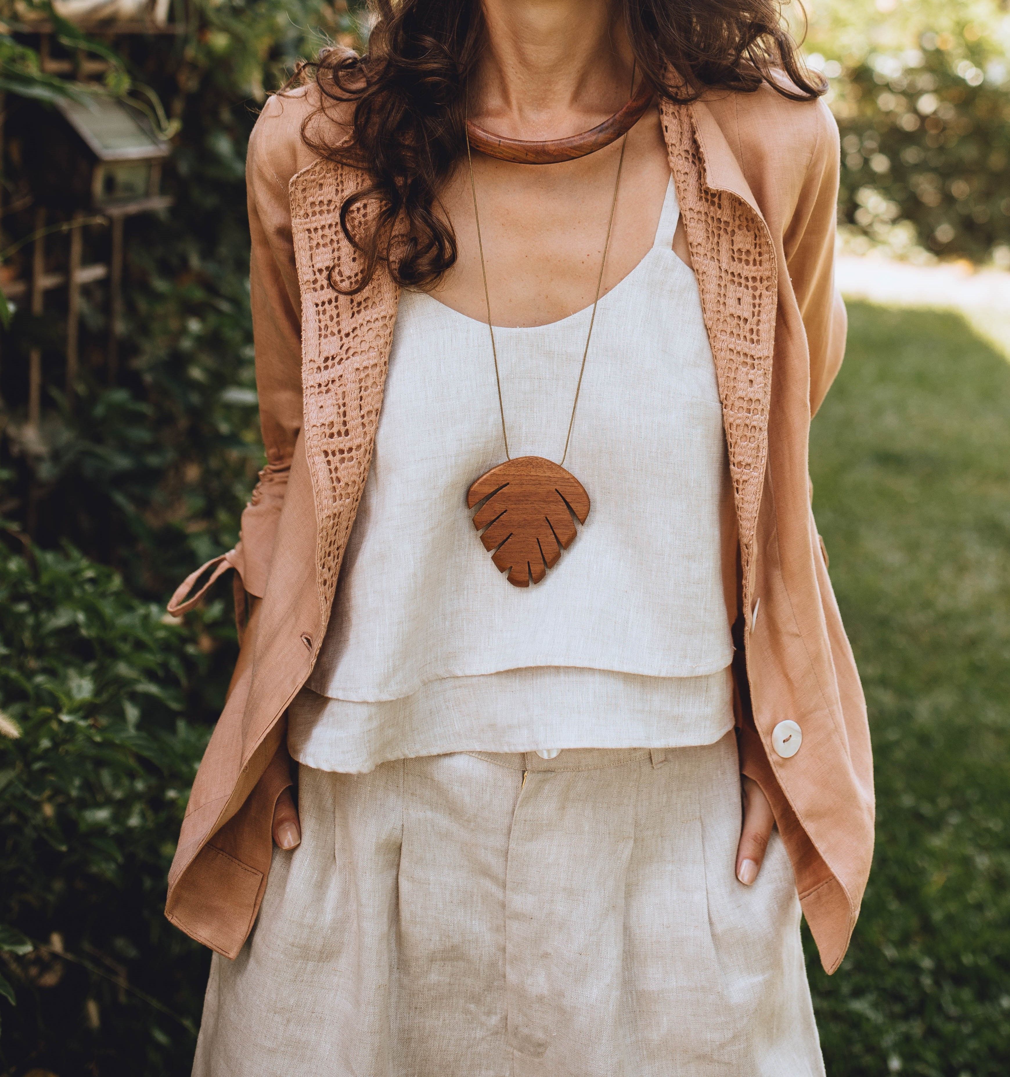 Quando os colares são de materiais naturais como a madeira, combinam muito bem com tecidos orgânicos como o linho e o algodão, por exemplo.