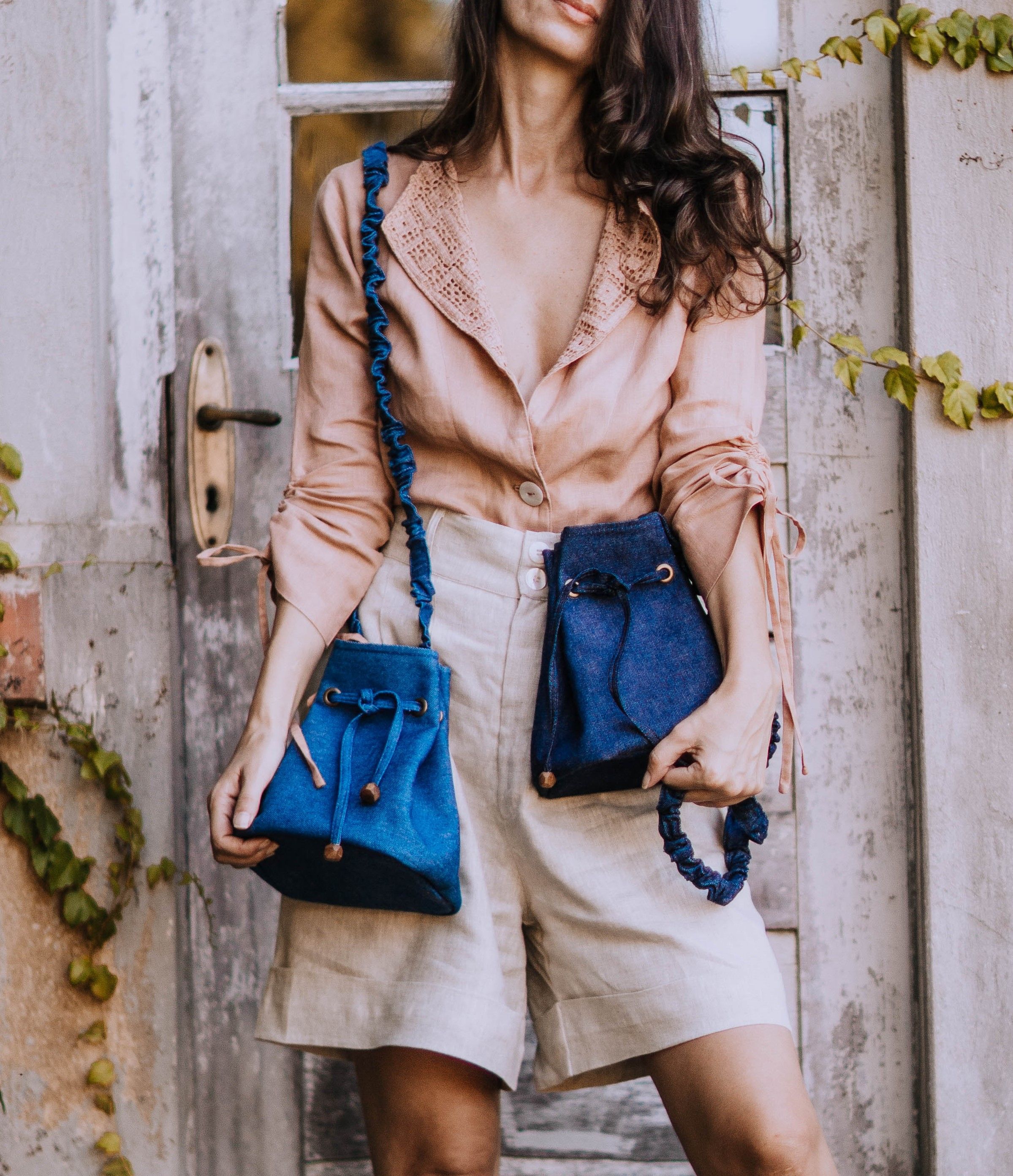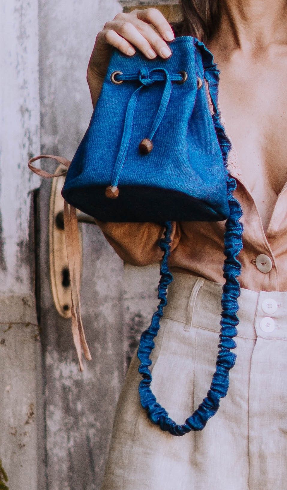 Na versão da Proposta Verde foi feita de forma artesanal, com jeans de sobra industrial dublado e estruturado, ponteiras delicadas de madeira de demolição e a alça franzida traz movimento e feminilidade.